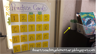 I made this very unfancy pocket chart that is numbered with the students' numbers. (I'm not happy with the way the title came out but it will have to do for now.) I placed the practice cards nearby on my library shelf. If a student breaks a rule after a warning they get a practice card placed in their pocket. During recess or free time, anyone with a practice card in their pocket needs to practice that rule by doing the hand motions that go with it and saying it quietly to themselves.